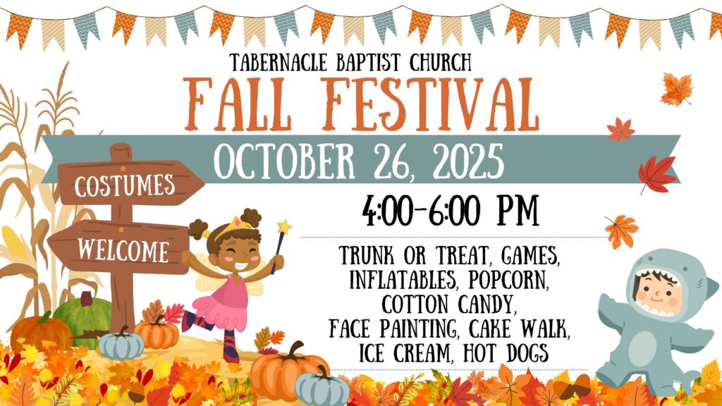 Get ready for an evening of fun, food, and fellowship for all ages at our Fall Festival on October 26 from 4- 6 PM! Bring the whole family and invite your friends!