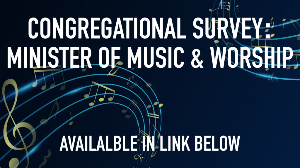 As the search for our next Minister of Music and Worship continues, the committee would love some input from the congregation! Take a moment to complete this short online survey (less than 3 minutes). Please submit your response by October 12.