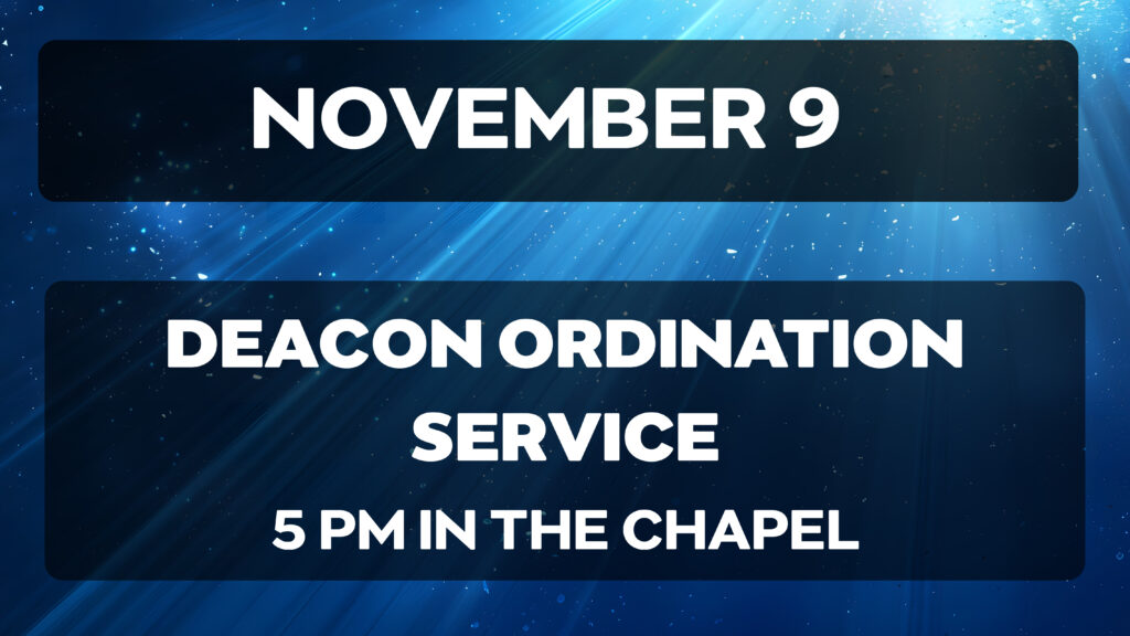 Please join us for a Deacon Ordination Service on Sunday, November 9, at 5 PM in the Chapel. Eric Dalton, Clint Hoffman, Kelly Heggeland, and Allyson Bretch will be ordained during this special and meaningful service. A cookie and punch reception will follow in the Heritage room. We will also honor our new Deacon Emeriti Peggy White, Don Hall, Bill Fullilove, and Jerry Casey during the morning service on November 9.